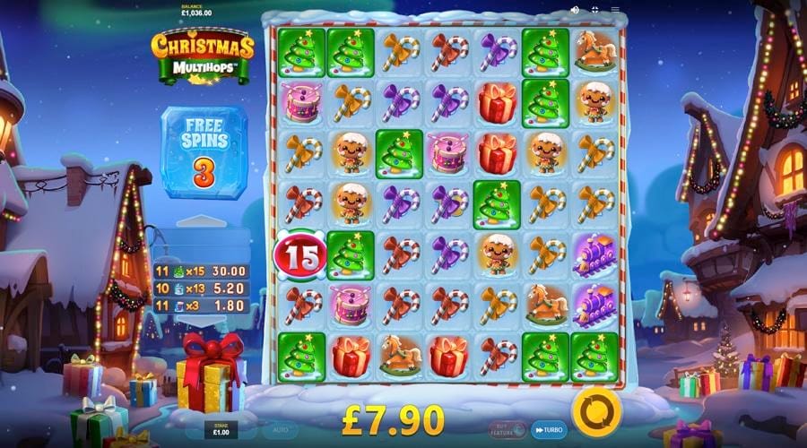 Christmas Multihops has a playing field that features 7 reels and 7 rows. Max Win Gaming decided to use the Pay Anywhere mechanic. It allows the players to get a payout as long as they match a certain number of symbols on the grid, regardless of their positions.