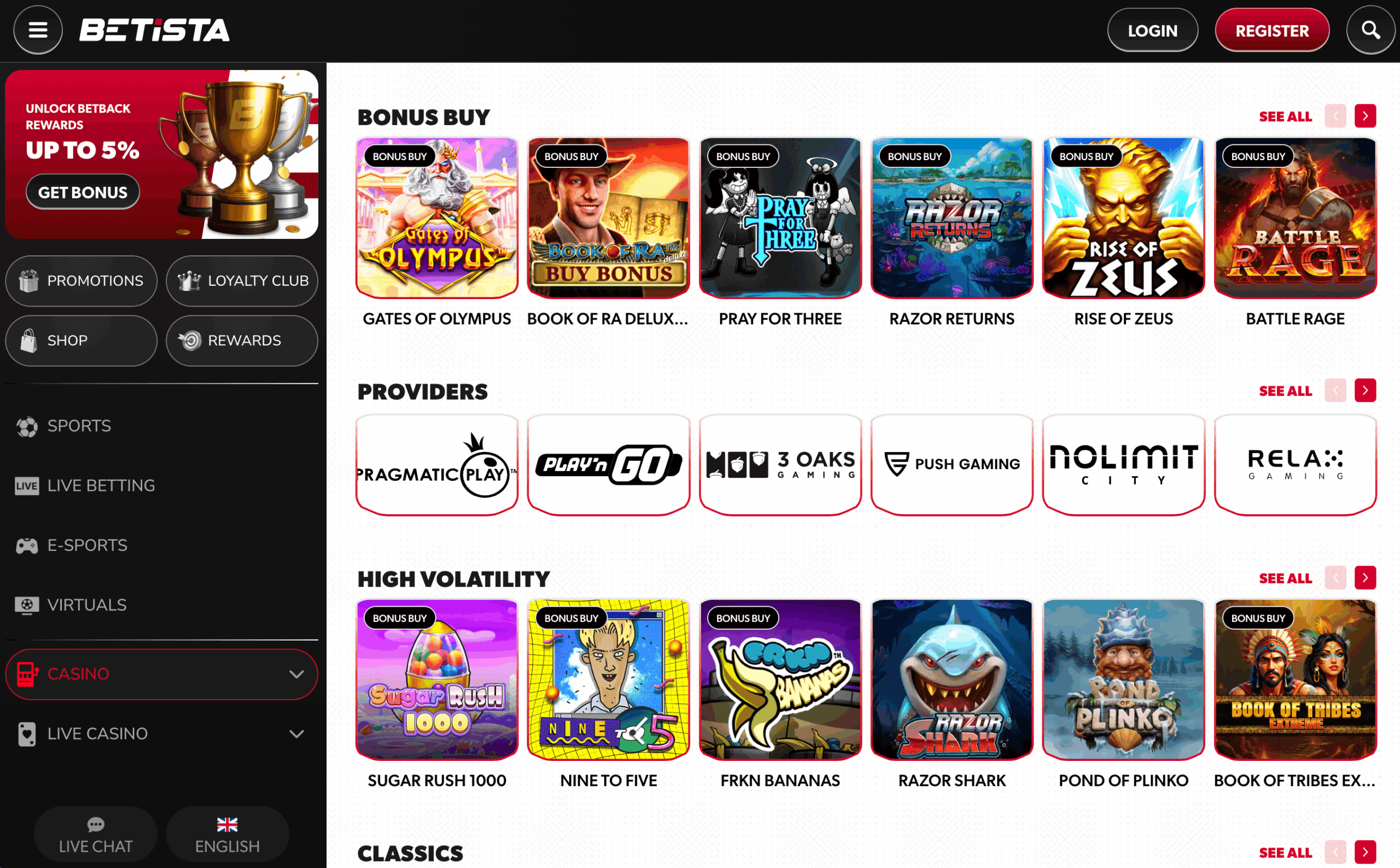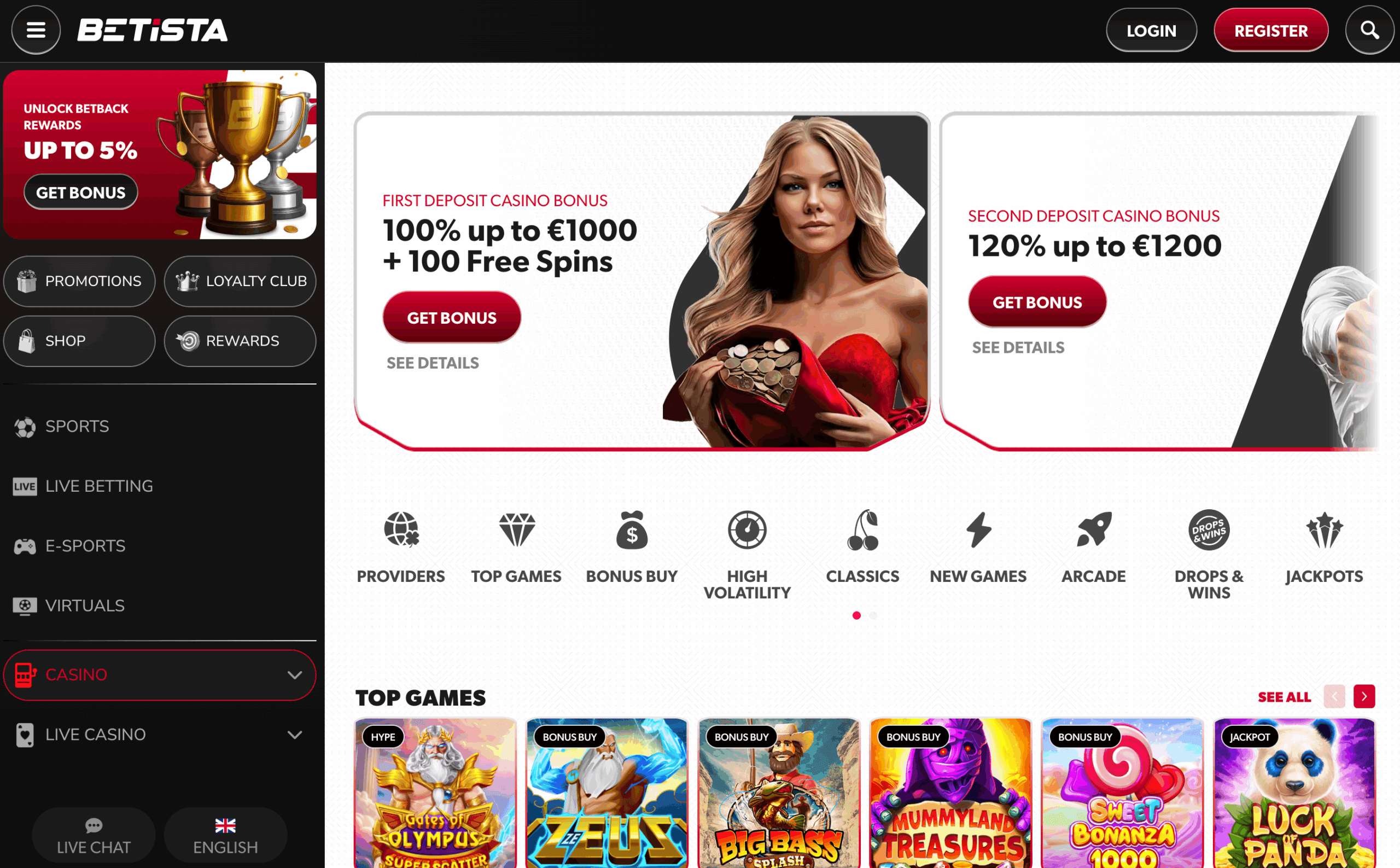 Sleek and Modern Design: Betista greets players with a polished layout and an easy-to-navigate drop-down menu on the left. Whether you’re hunting for promotions, game categories, or other features, everything is conveniently placed for quick access.
