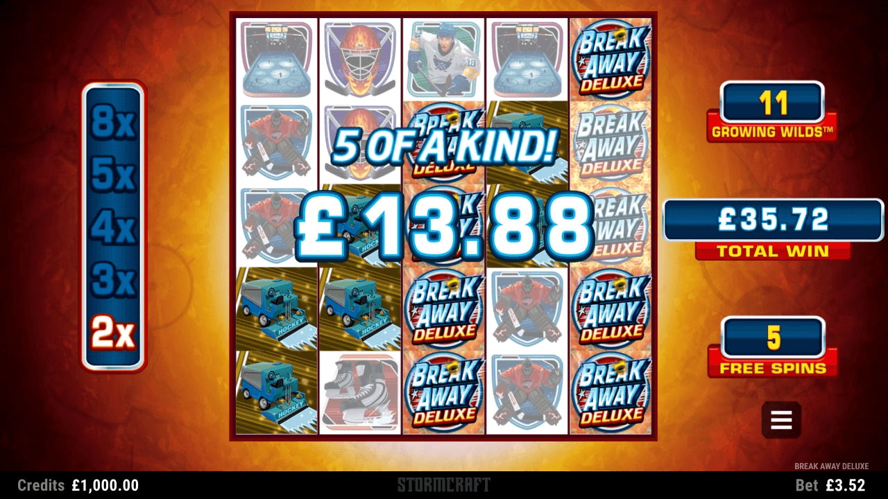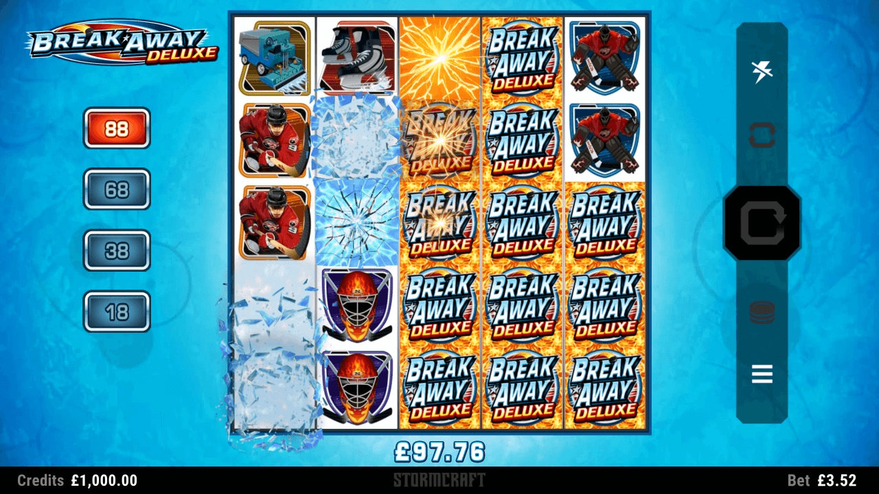 There’s a random feature in Break Away Deluxe called Smashing Wilds, where hockey players will make an appearance and turn reels wild. There’s a guaranteed win when this happens, and the wild reel(s) will stay in place for consecutive rolls.