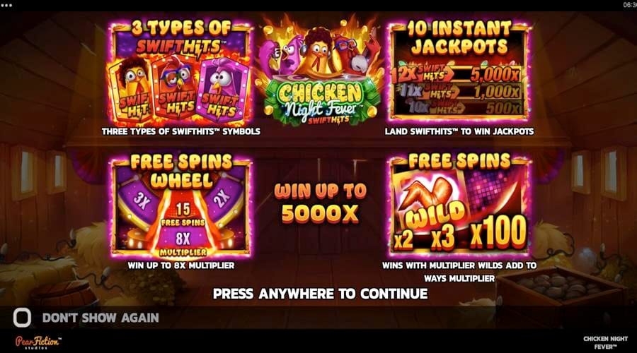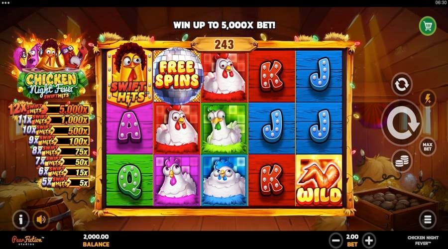Chicken Night Fever really struts its stuff with features that’ll make you want to boogie all night long. SwiftHits symbols come in three varieties – regular, respin, and split – and they could award you up to 5,000x your bet.