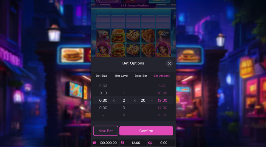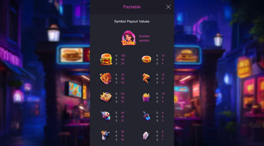 Diner Frenzy mobile slot from PG Soft uses a neon diner theme with bright food icons and a clean reel frame that keeps the screen easy to read.