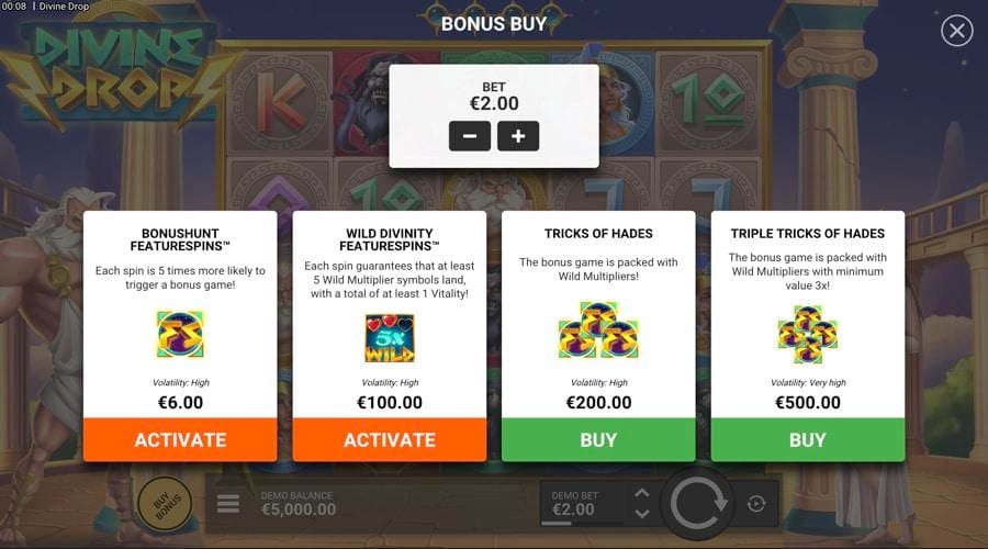 In Divine Drop, you’ve got a bunch of cool stuff to help you win big, like Wild Multipliers with lives, special symbols, a Hades bonus game, a super Hades bonus game, and you can even buy bonuses.