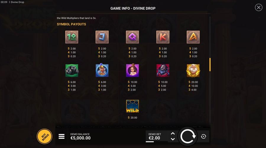 The lower-paying symbols in Divine Drop are Greek-style 10 to A card ranks, which give 1 times the bet for five of a kind. Higher-paying symbols include Cerberus, a golden-helmed character, Aphrodite, Hades, and Zeus, with payouts ranging from 3 to 10 times the bet for five of a kind.