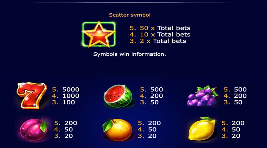 All fruits pay solid prizes for three or more, but the real big payouts are reserved for the sevens and stars. The bright red 7 pays a whopping 5,000 coins for 5 on a line, or 1,000x for a count of four.