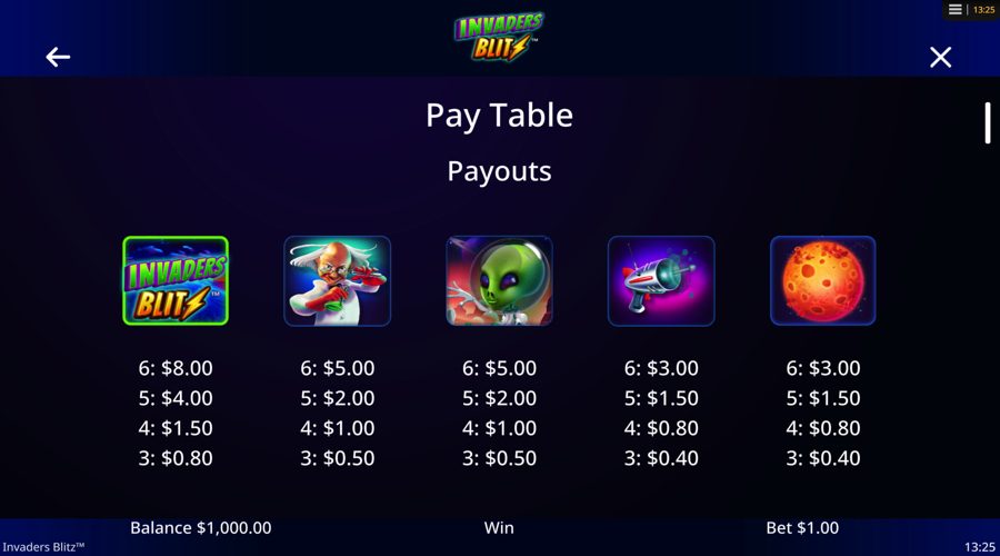 Invaders Blitz can be played in demo mode at Slots4Play, which helps test the collect timing and the two Free Spins options with play credits.