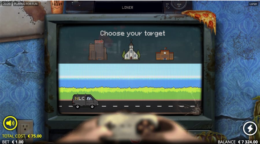 Loner slot game lives on its monitor symbols. Three of them on the screen wake the TV host and send the player into one of several mini games, each with its own way to hand out prizes.