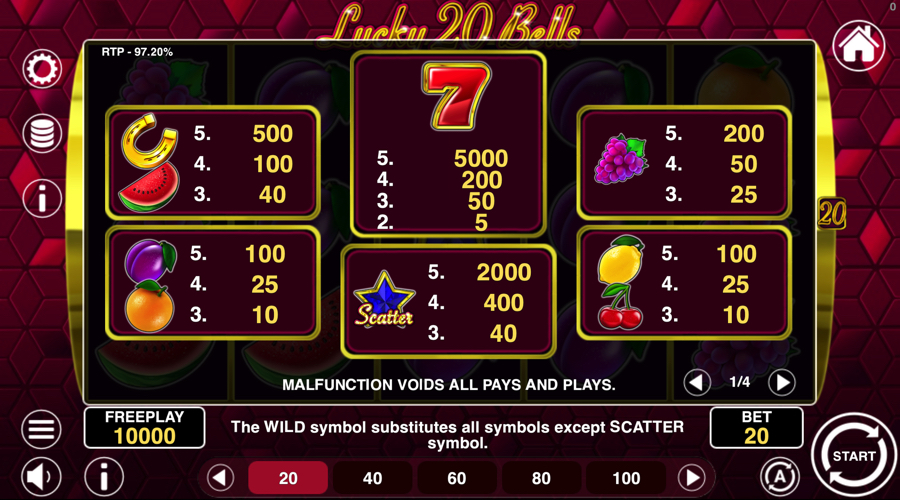 Lucky 20 Bells uses a classic fruit style setup with bright fruits, red sevens, bells and star icons on a clean reel frame.