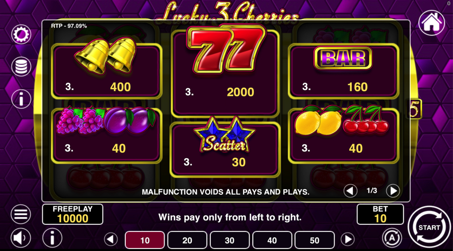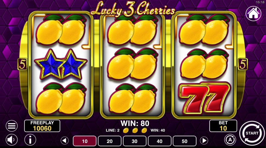 The most distinct rule in Lucky 3 Cherries appears when every position shows the same fruit. If cherries, lemons, plums, or grapes take over all nine spaces, the slot counts the full set of line wins for that spin and then doubles the total. Bells, BAR icons, and sevens do not take part in this rule, so the focus stays on stacked fruit combinations. These full screens feel different from regular three-of-a-kind lines.
