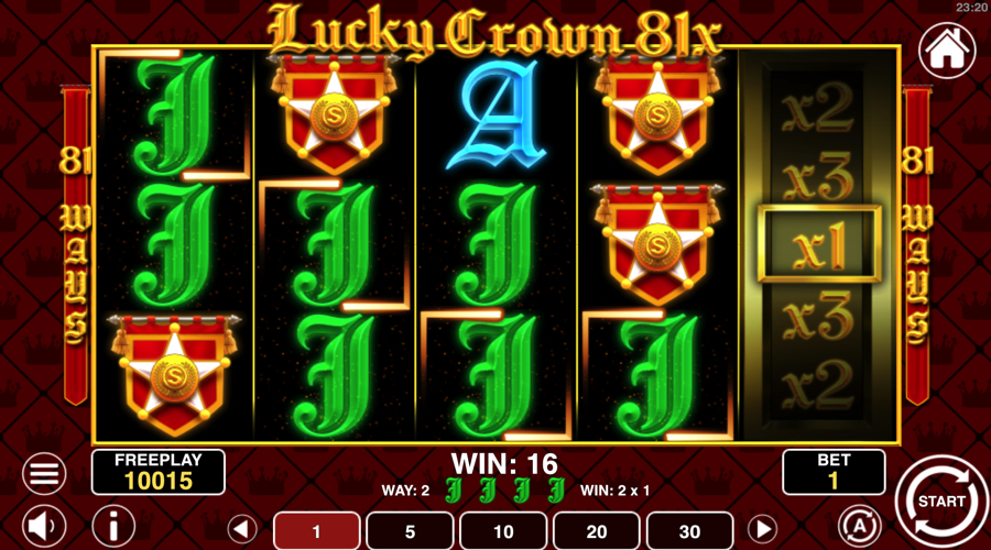 Golden crowns, coins, shields, and banners sit on a deep red backdrop around a compact reel set. We present you Lucky Crown 81x classic demo slot from 1spin4win casino developer.
