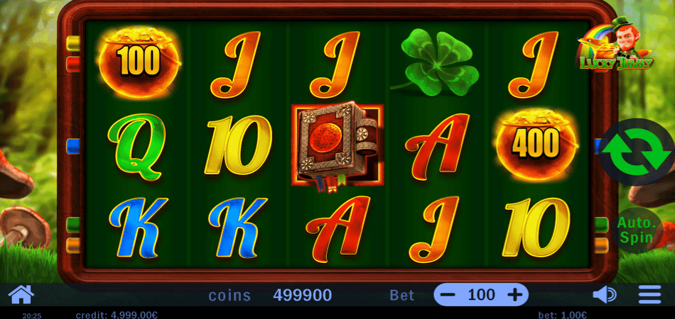 Lucky Jimmy slot game is looking to share some of his luck with you and has many ways to do so. From the usual low-paying playing card symbols of 10 to Ace that pay 100 credits when 3 of the same symbol lands at the maximum bet, as well as the main feature symbols that are the scatter/wild and the pot of gold symbols.