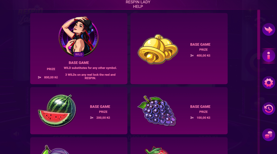 Respin Lady presents a fruit cabinet setup on three reels and three rows, with five fixed paylines that keep results easy to verify.