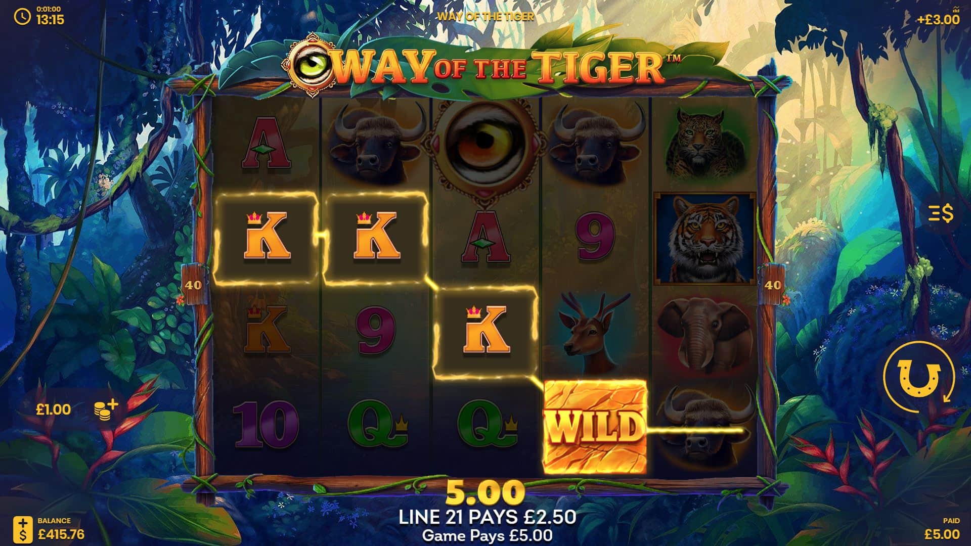 At the end of the last Tiger Trail spin, the sum of all the scatter multipliers is awarded to you as a multiplier of the triggering bet of the feature.