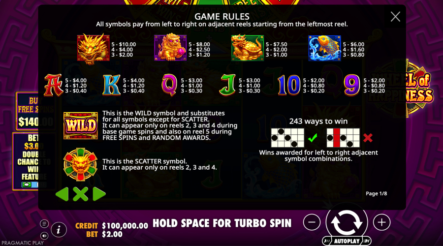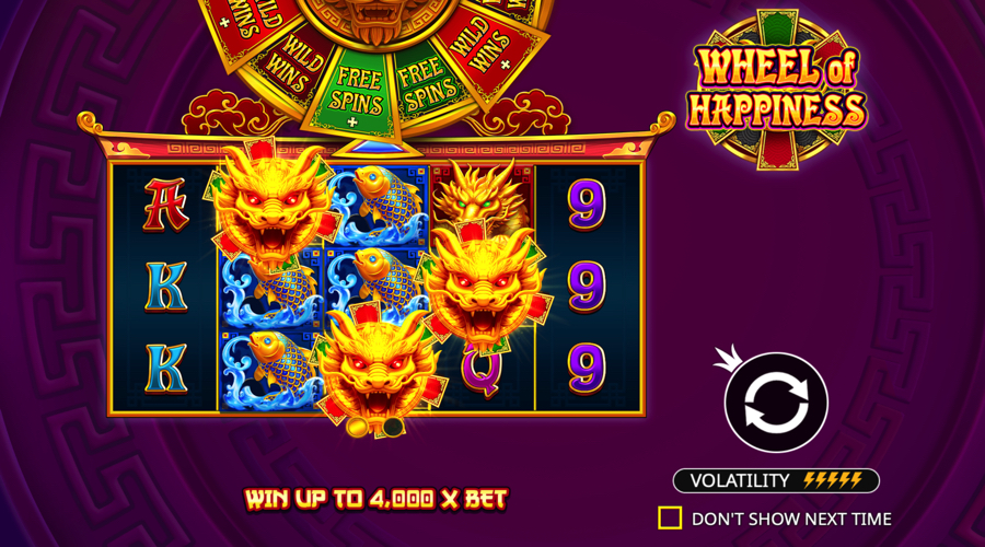 Wheel of Happiness comes from Pragmatic Play and runs on five reels and three rows with 243 ways to win. The game uses high volatility, so results often arrive in clusters rather than in a steady drip. Wins form left to right on adjacent reels, so each spin rewards symbol coverage across the screen.